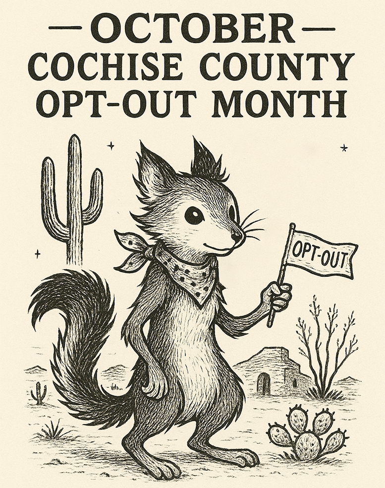 On Tuesday, our county’s Board of Supervisors will be voting on the first agenda item in 20 years that boosts the Opt Out Permit instead of diminishing it, a proclamation declaring October as Cochise County Opt Out Month. Huzzah.